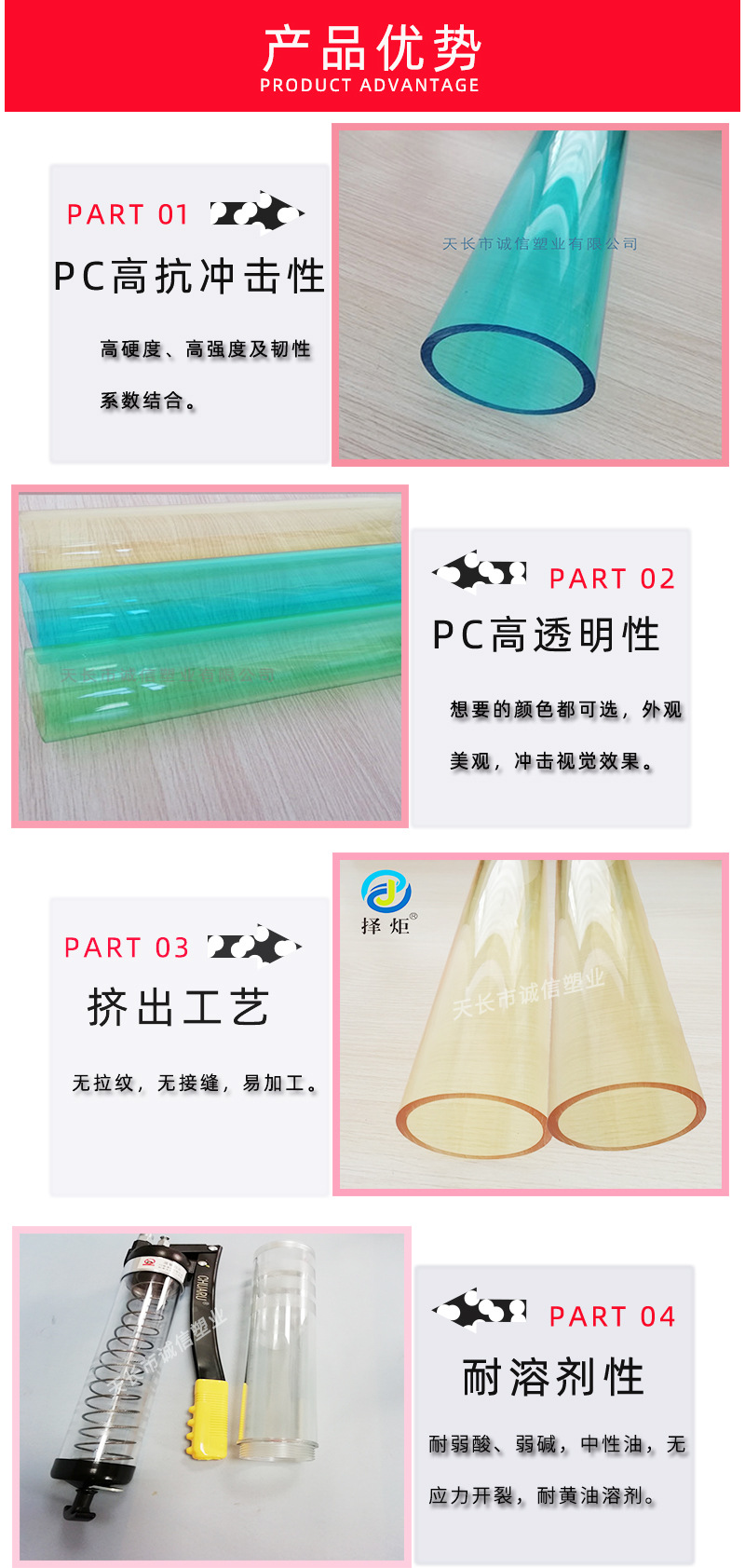 公司經(jīng)過(guò)長(zhǎng)期以來(lái)的生產(chǎn)實(shí)踐和創(chuàng)新完善,選用進(jìn)口原材料,使用新型大型生產(chǎn)設(shè)備生產(chǎn)的高透明度PC管/型材系列產(chǎn)品,更好的滿足了國(guó)內(nèi)外客戶的高品質(zhì)要求,深受國(guó)內(nèi)外市場(chǎng)歡迎和好評(píng)。